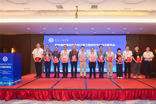 论坛还举行了数字道路建设技术浙江省工程研究中心技术委员会聘书颁发仪式。宁波工程学院校长邵千钧代表学校向来自同济大学、东南大学等国内交通方向顶尖高校,以及中汽研、海康威视等行业龙头企业的技术专家颁发聘书。
